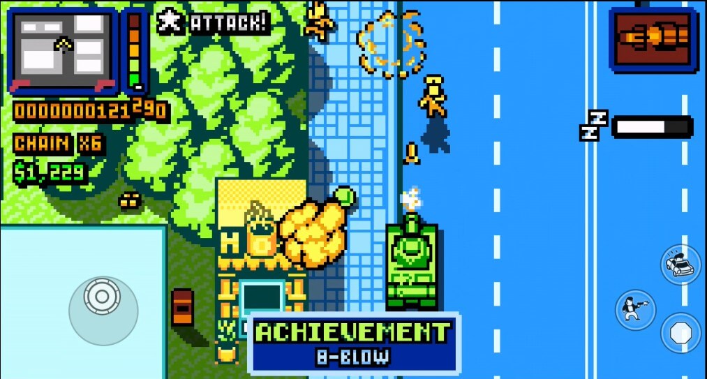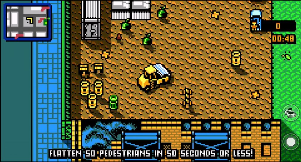 The gameplay is just like what the title says: go on a rampage in a retro city. Score points by wreaking havoc on unaware and unwilling citizens of Theftropolis. Run over pedestrians, bump other vehicles off the road, and take out cops who will try and put a stop to your insanity. Mobile controls make use of a direction pad for navigation and action buttons. You can shoot on the move, shoot from cover, get behind barricades and obstacles, and hop aboard a car. You can jump aboard any car in the game, but you would have to kick the driver out on some of them. Vehicle controls will be different. You get buttons for forward and reverse gear. The direction pad is plainly for steering your vehicle to where you want.